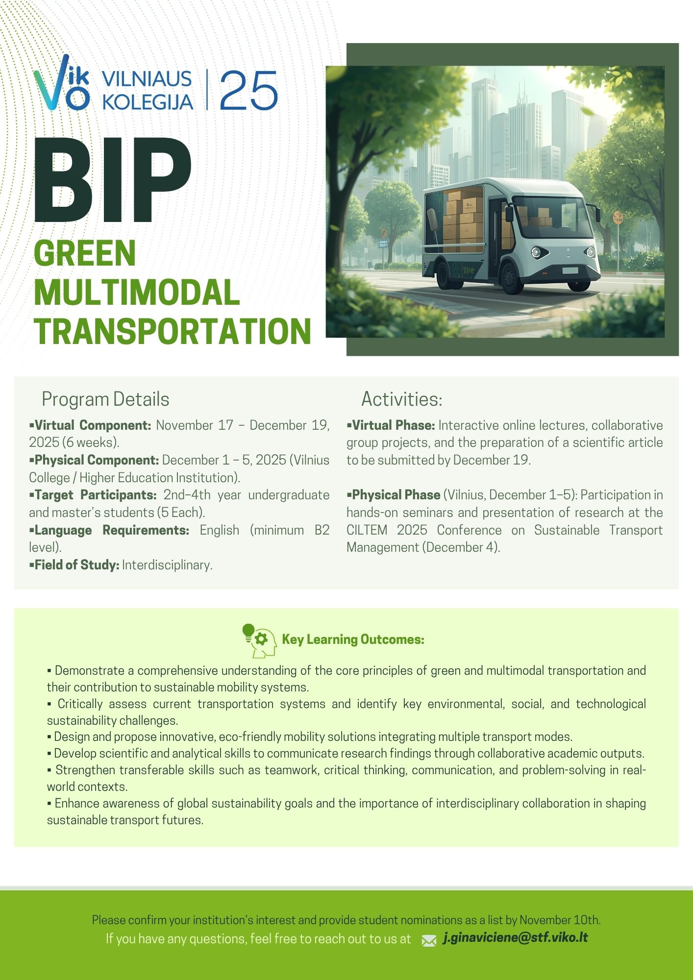Uczelnia partnerska z Litwy - Vilniaus Kolegija zaprasza studentów studiów I stopnia (2 i 3 rok) oraz studiów II stopnia na Intensywny Kurs Mieszany (BIP)  “Green Multimodal Transportation”