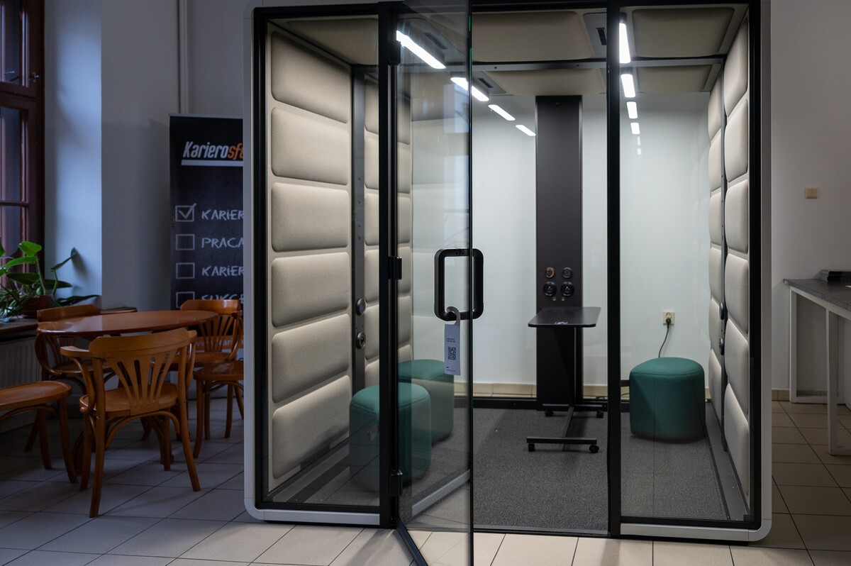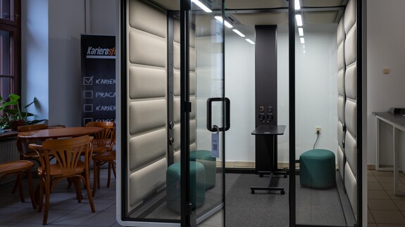 Z przyjemnością informujemy, że na Wydziale Ekonomii i Finansów pojawiła się nowa kabina akustyczna, dostępna dla wszystkich studentów. To komfortowa, wyciszona przestrzeń, idealna do prowadzenia rozmów online, udziału w zajęciach zdalnych, pracy nad projektami wymagającymi skupienia czy przygotowania prezentacji. Zachęcamy do korzystania z nowej infrastruktury wspierającej naukę i organizację pracy własnej. Kabina znajduje się w "Kreatorni", obok Dziekanatu, przy pokoju nr 104.