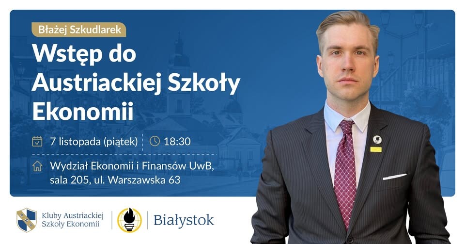 Prelegentem będzie Błażej Szkudlarek - Krajowy Koordynator Klubów Austriackiej Szkoły Ekonomii, a także Students For Liberty - Polska, Laureat stypendiów przyznawanych przez: Instytut Misesa, Objective Standard Institute, Young Voices oraz New Intellectual Network, zawodowo będący analitykiem ilościowym w bankowości inwestycyjnej.