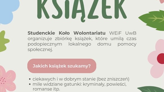 Studenckie Koło Wolontariatu WEiF UwB organizuje zbiórkę książek, które umilą czas podopiecznym lokalnego domu pomocy społecznej. 😊